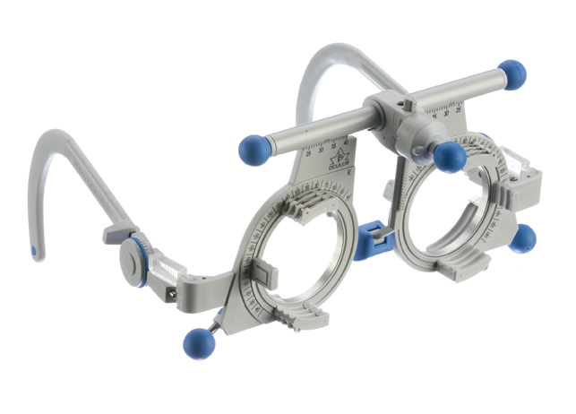 Space for 10, 38mm trial lenses. PD range 46 – 82mm. Has adjustable angle and length of the side, adjustable vertical angle and height of the nosepiece, axis adjustment, Vertex distance scale.
